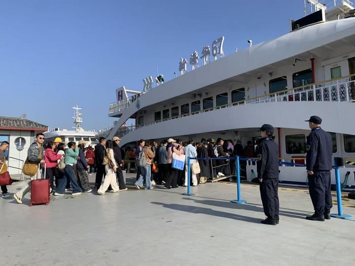 为此,浙江省海事部门在热门航线加密现场巡查力量,依托智慧海事系统实现重点水域24小时动态监管,朱家尖至普陀山客运航线日发班艘次由节前的220艘次增至700艘次,确保旅客疏运高效有序。