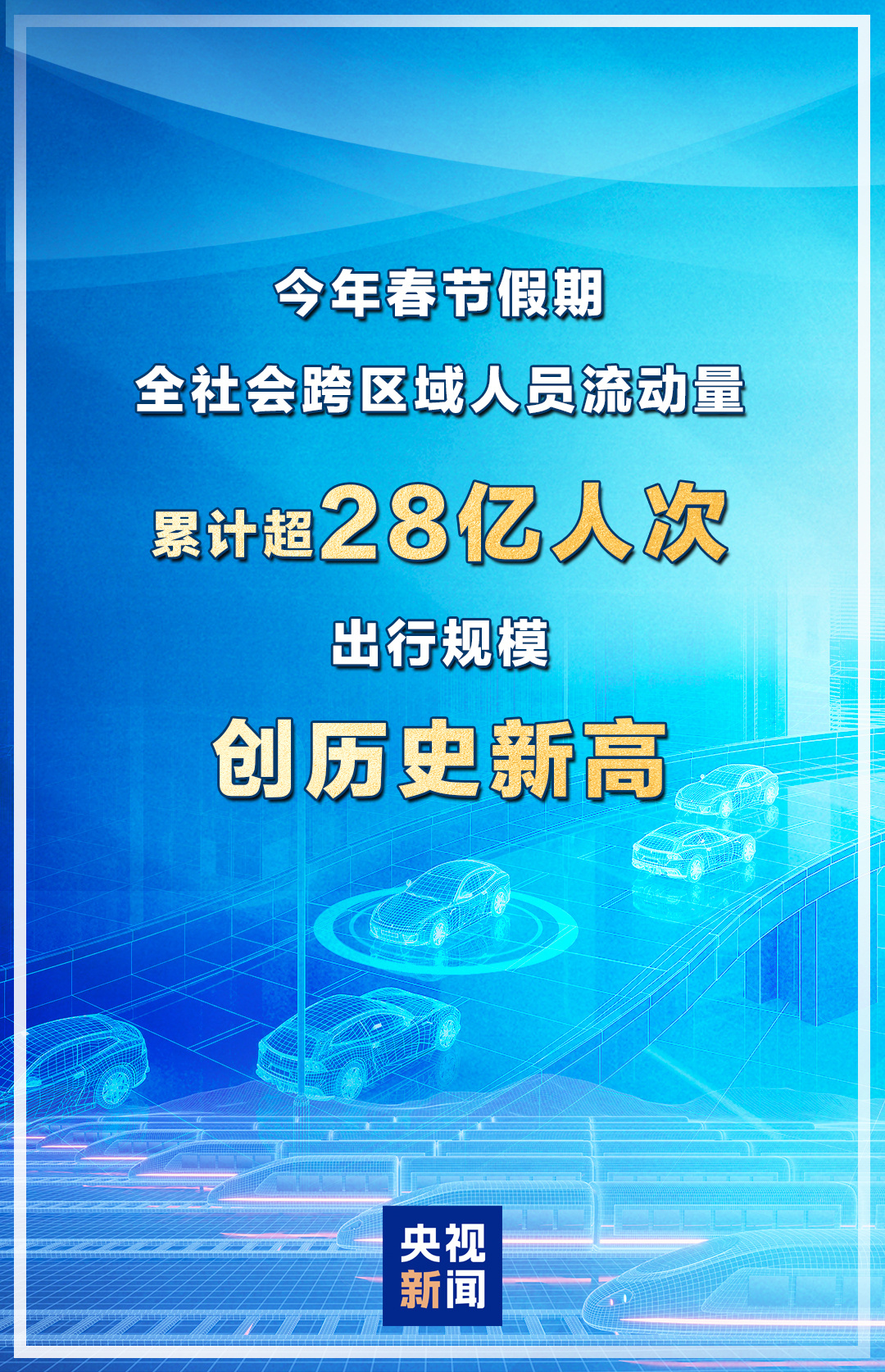 交通运输部数据显示,春节假期期间,全社会跨区域人员流动量累计超28亿人次,日均3.11亿人次,同比增长8.2%,出行规模创历史新高。