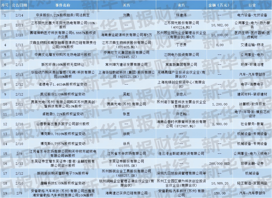2.高额交易:东吴证券向全资子公司东吴证券(香港)金融控股增资(20亿港元);中南文化拟收购江阴苏龙热电控股权;江苏省东辛农场购入中核苏能核电4%股权;新锐股份收购慧联电子70%股权。