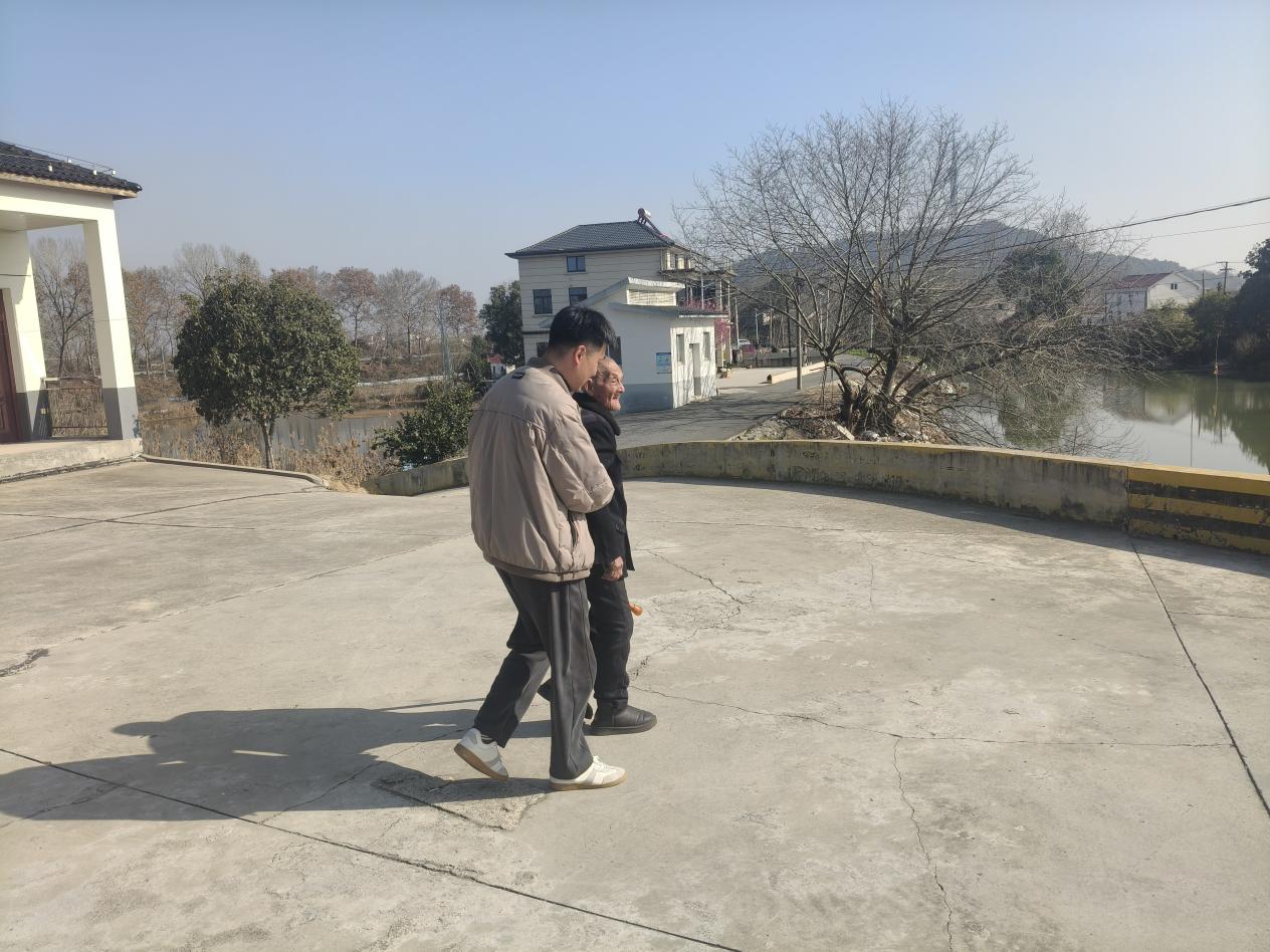 为提高搜寻效率,孔玉金迅速将相关情况上报村委会,协同村委工作人员启动应急查找机制,采取实地搜寻+视频追踪双线并行模式开展工作:一组人员对村庄周边、重点路段及老人常去区域进行拉网式实地查找;另一组人员通过村级监控系统逐点排查、锁定轨迹。经过快速排查,工作人员在距离秀山村秀山自然村约2公里的浮山圩局附近发现老人行踪。