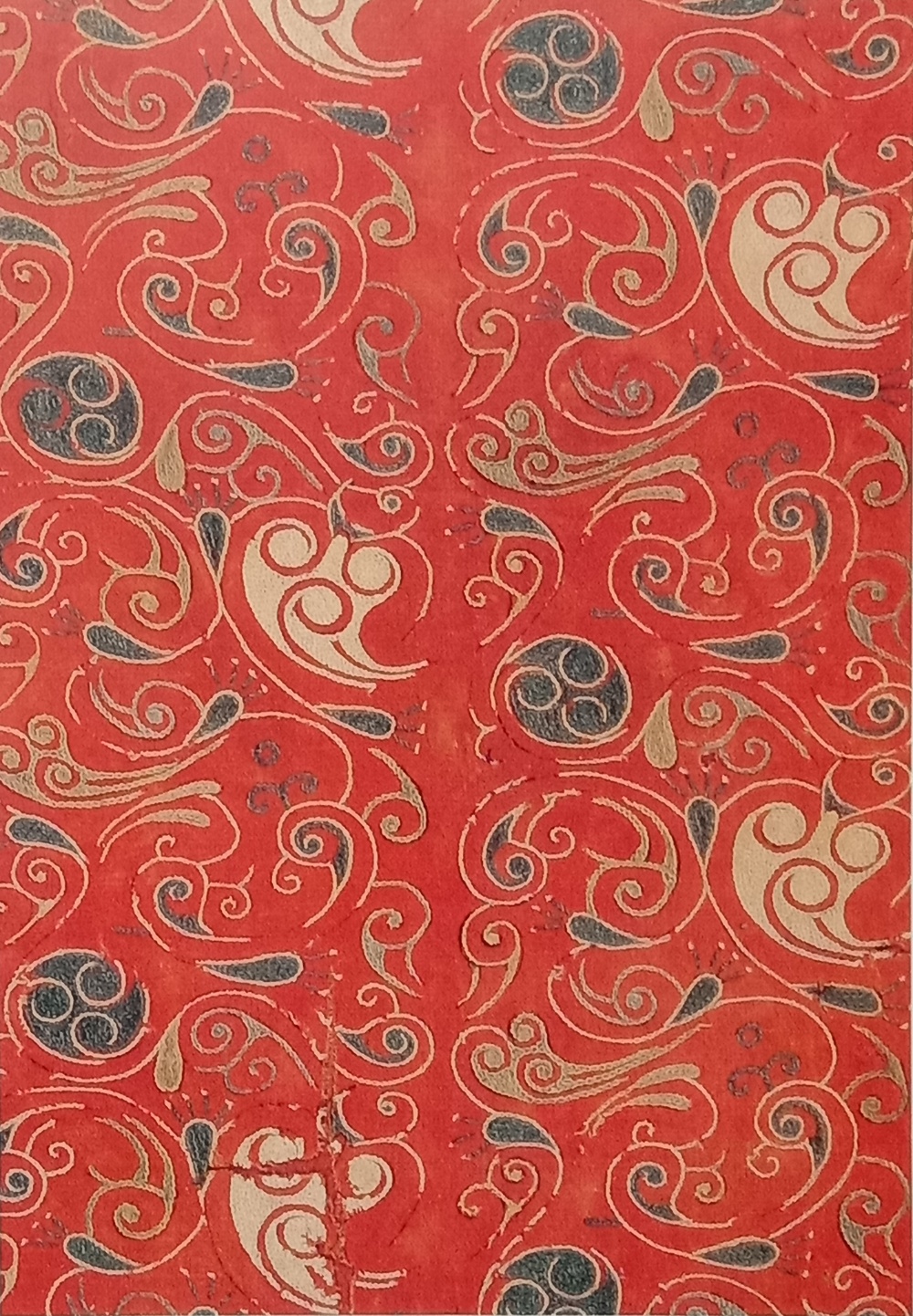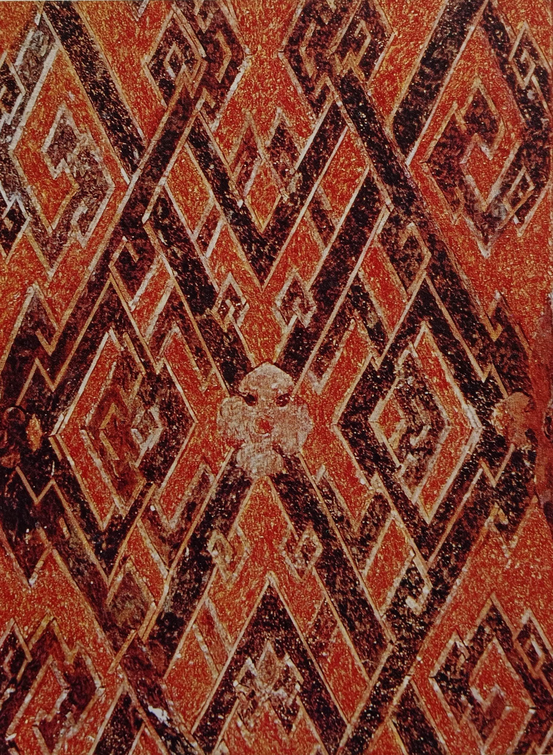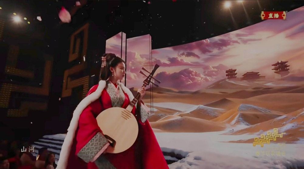 《贺花神》中王昭君手持琵琶,穿红色袍服,红色披风,展现的汉家女远赴塞外的豪迈。衣领等边缘饰有湖南马王堆汉墓出土丝绸品的纹样云气纹、对鸟菱纹,搭上汉朝元素,汉家时尚。历史上文人咏颂昭君出塞,往往都是叹息,“明妃去时泪,洒向枝上花”,但是《贺花神》中王昭君着鲜艳的红袍,却是阳光的心态,散发着奋进的光芒。