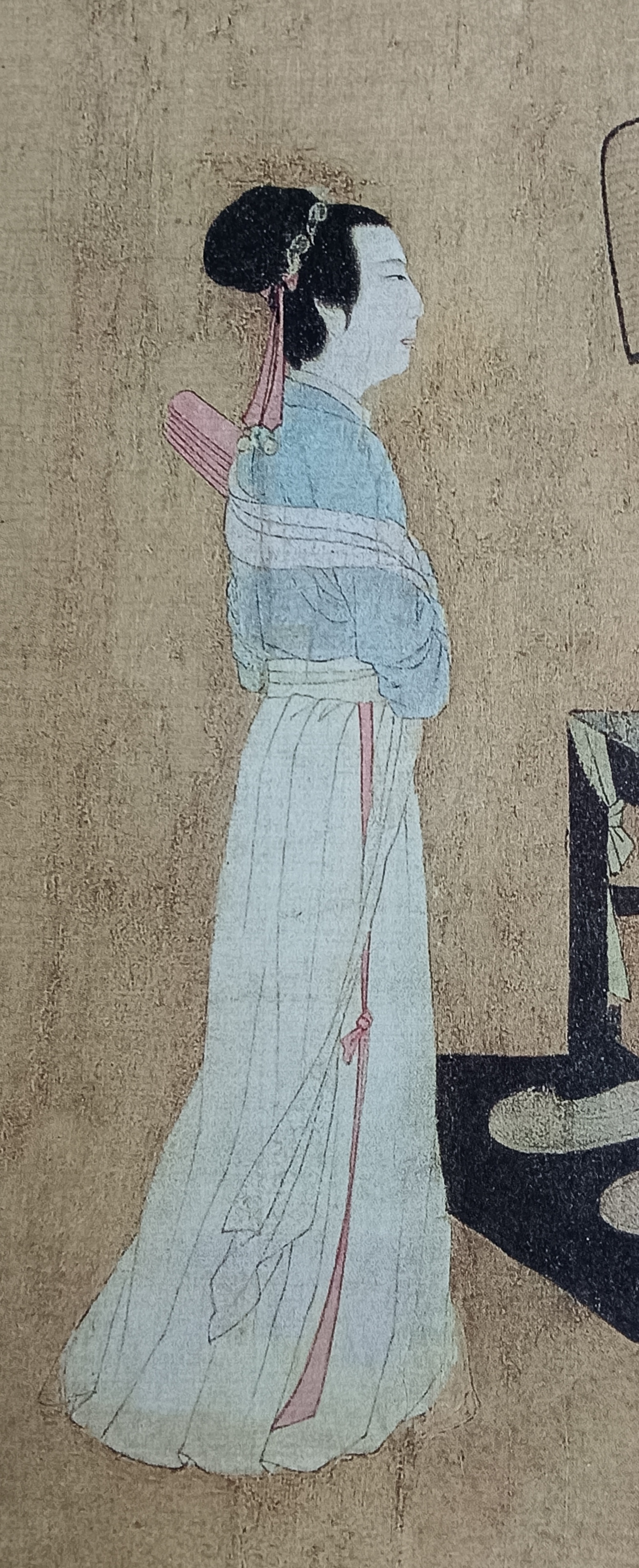宋代女子内衣主要是抹胸,上可遮胸乳,下可遮肚腹。通常以素绢为之,双层,内衬少许丝绵,上端以及腰部各缀绢带两条,以便系扣。唐代女性有外穿襦裙,内衬抹胸,搭披帛的形象。宋代妇女也有穿开领大袖衫或背子,内衬抹胸的穿衣习惯。