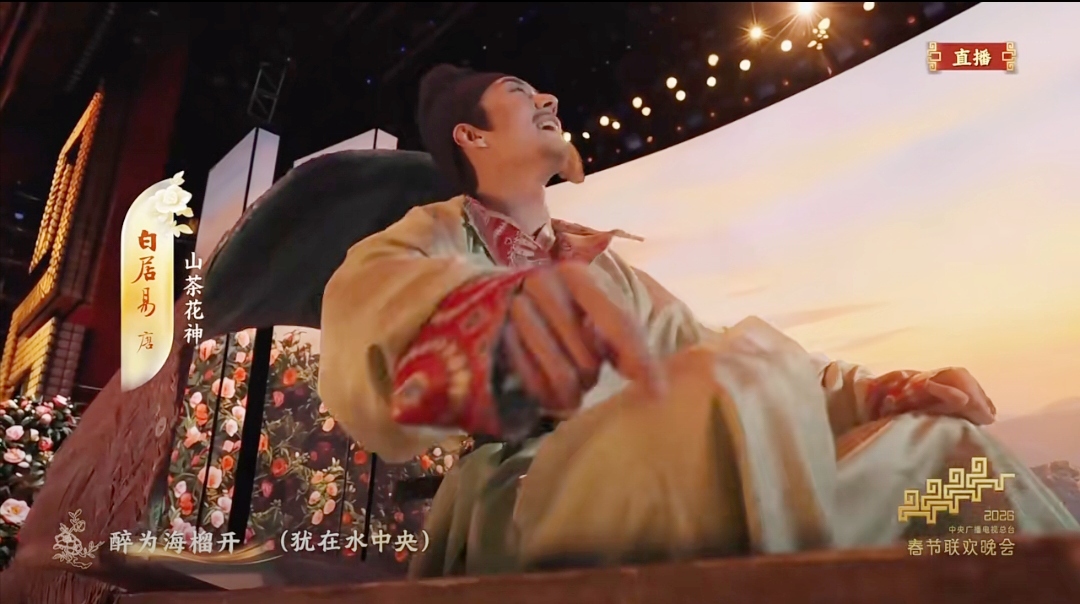 《贺花神》中白居易穿翻领胡服,戴幞头,鬓角插山茶花。鬓角插花是追求时尚美,胡服则彰显中外文化的交流与融合。