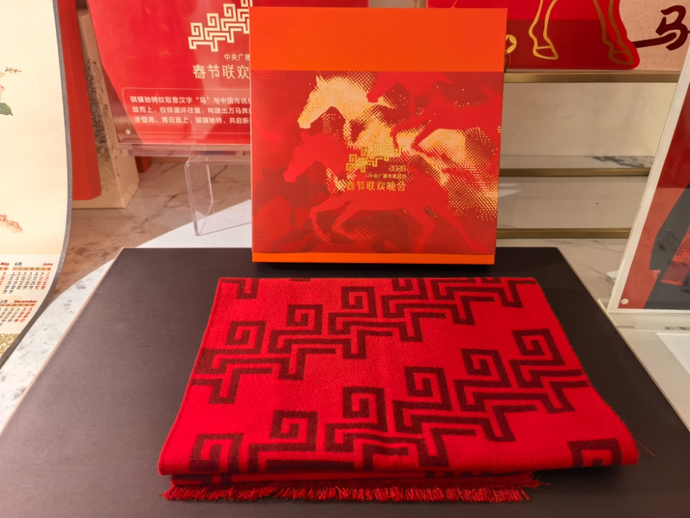 文创领域,老字号同样紧跟顶流。“这是万事利丝绸和央视春晚联名的‘骐骥驰骋’红围巾,春晚直播中,主持人、嘉宾都佩戴了它,人气特别高。”24日,位于南京长江路的南京万事利丝绸艺术馆内,店长赵晓威正热情地向顾客介绍。这款围巾的设计灵感源自2026马年春晚主视觉标识“骐骥驰骋纹”,设计师以中国传统云纹、雷纹、回纹为基础,巧妙勾勒出“马”的造型,四马并驱、拾级而上的图案,既展现出万马奔腾的磅礴气势,更寄寓着步步登高、青云直上的新春美好祝愿。“不仅吸引了大量个人消费者,不少企业都是批量采购,最多的一次性订了150件。”赵晓威称近期订单一直源源不断。