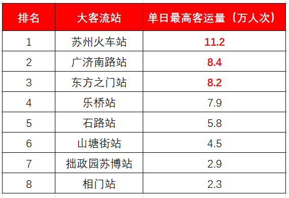 数据显示,苏州火车站、广济南路站东方之门站、乐桥站、石路站等枢纽站点客流量较大,单日最高客运量分别为11.2万人次、8.4万人次、8.2万人次。