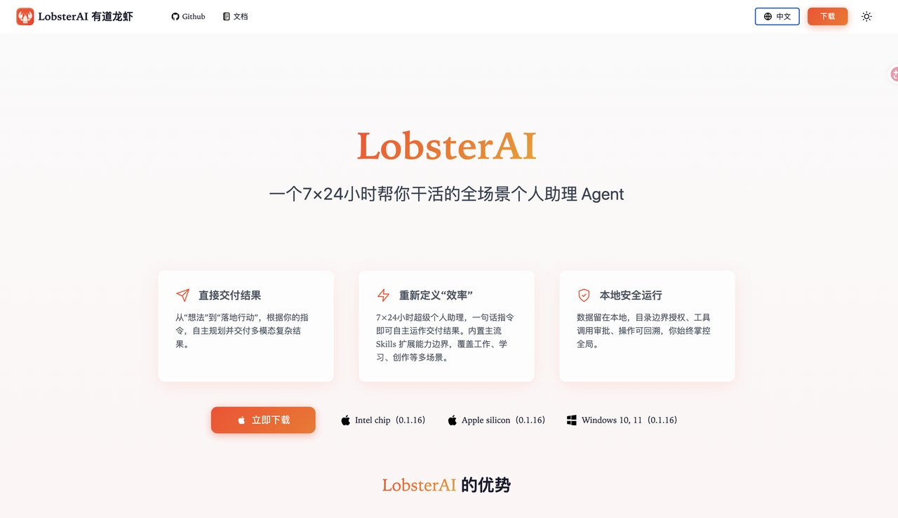 但让我最没想到的是,在这个赛道里扔下一颗深水炸弹的,居然是网易有道,他们最近发布了一款国产AI Agent,叫LobsterAI(中文名:有道龙虾),据说是“中国版OpenClaw”。