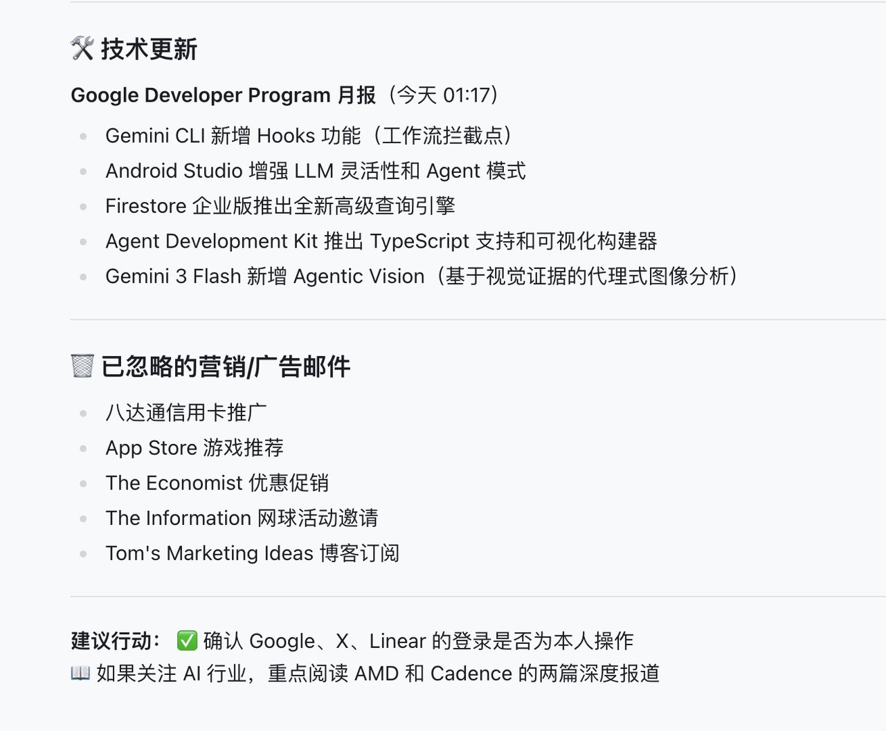 最让我意外的是报告的结尾,它像一个真正的Chief of Staff(幕僚长)一样,给我列出了建议行动:确认Google、X、Linear的登录是否为本人操作;