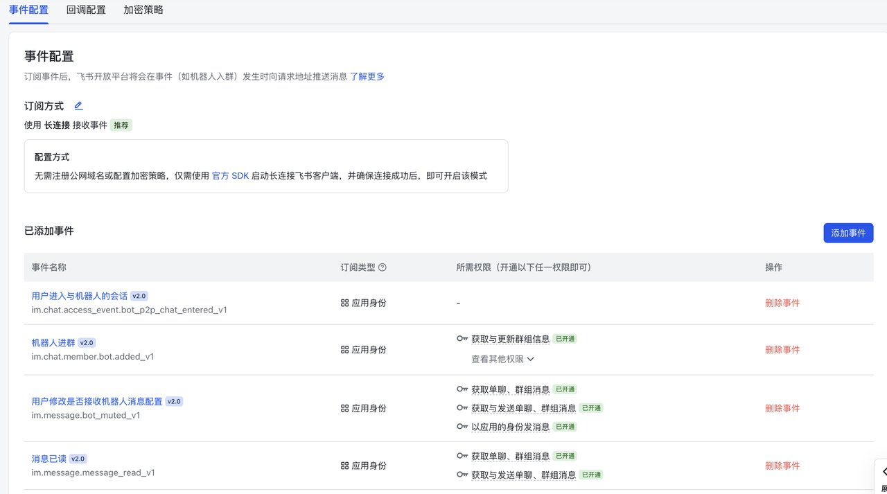 最后一步,回到飞书后台,进入「事件与回调」。这里 LobsterAI 采用了一个极其优雅的方案——推荐使用「长连接」。这意味着你不需要注册公网域名,不需要配置任何加密策略和复杂的内网穿透(Ngrok 等),直接通过飞书官方 SDK 就能穿透你家的局域网路由器!选择长连接后,在下方添加接收消息相关的事件。最后,点击左侧的「版本管理与发布」,将这个机器人上线。