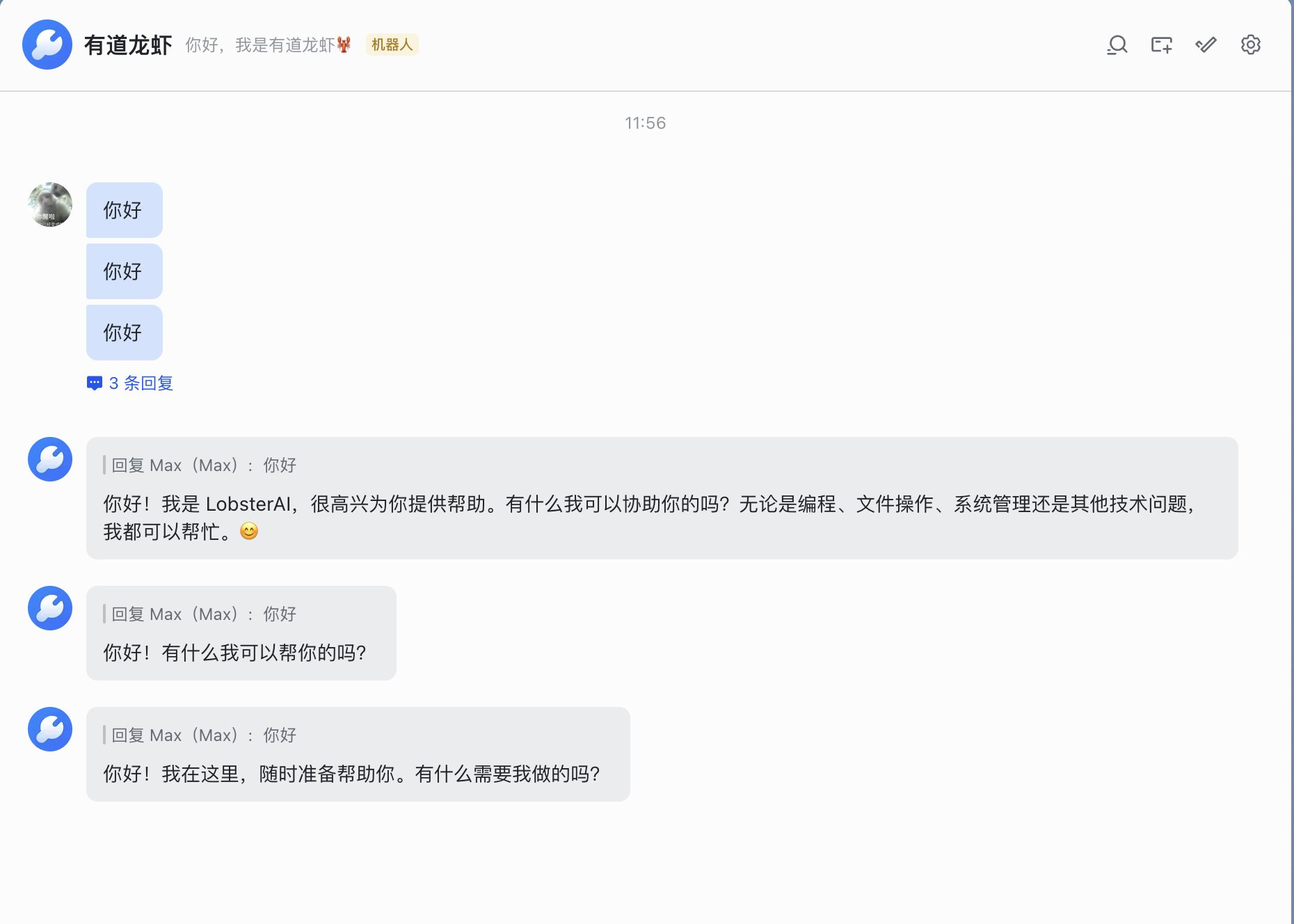 几乎是瞬间,电脑端的 Agent 进程就做出了响应,它在飞书里回复我:你好!我是 LobsterAI……无论是编程、文件操作、系统管理还是其他技术问题,我都可以帮忙。