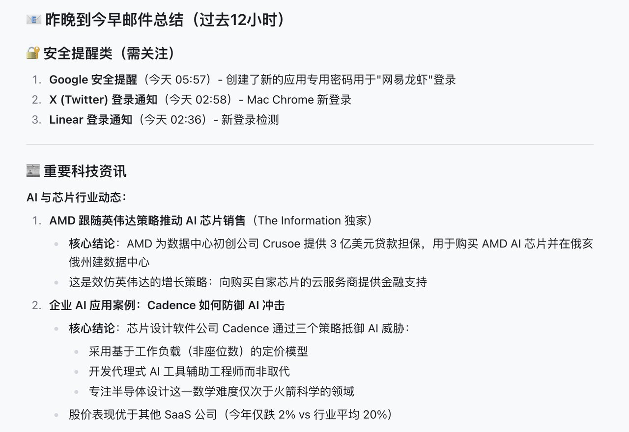 几分钟后,它给我交付了一份令人极度舒适的《昨晚到今早邮件总结》。这份报告完全不是简单的关键词堆砌,而是展现出了极强的阅读理解能力:它把系统安全提醒(Google、Twitter、Linear的异地登录通知)放在了最前面,提醒我优先关注。