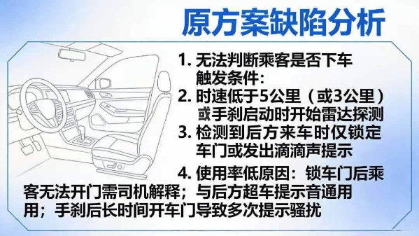 该方案的出现纯属歪打正着,原本吉利为了减少开门杀,也做出了不少努力,许多车型就安装有毫米波雷达减少开门杀技术。但是该技术较重要的一个问题就是无法判断乘客是否下车,于是就采用了拉动手刹作为判断依据。在实际使用中,许多乘客下车时候就是司机踩一下刹车,乘客开门下车,所以并不拉手刹。还有一种情况就是司机拉手刹了不下车,在车里休息一段时间再下车,如果在城市的路边停车位,常会有川流不息的电动车车流,这时候如果使用的是锁定技术,就语音司机一次次解释,还有可能乘客用力过猛开车门。如果使用的是声音提示技术,就会有重复提醒造成的骚扰问题,所以拉手刹不等于乘客要马上下车,这项技术也就变成了一种骚扰,骚扰几次之后,司机就不得不关闭。再加上许多司机的自负,认为这种事情不会出在自己身上,所以该技术使用率不高。还有一些厂家的判断标准是时速低于5公里或者3公里,同样无法做到如何判断乘客下车的难题。