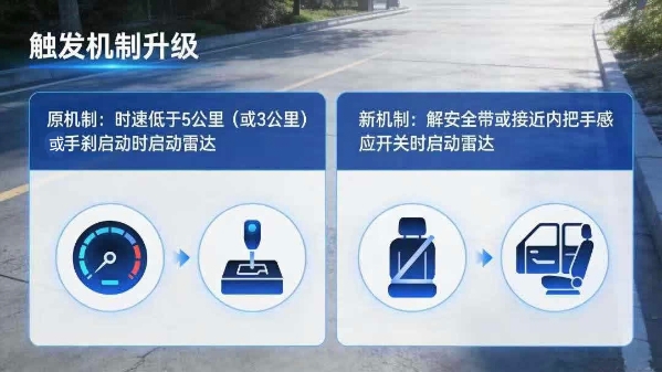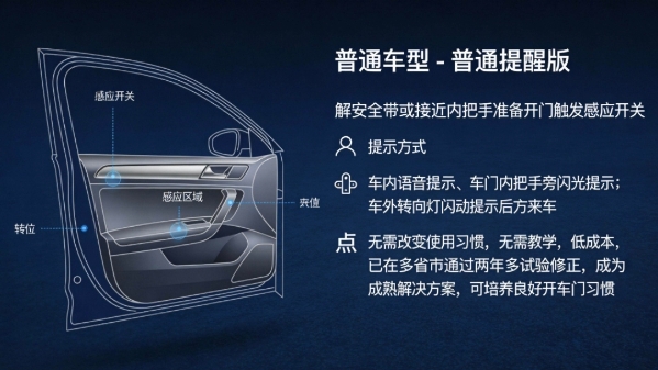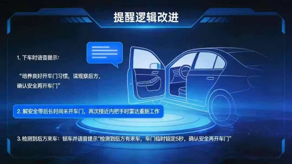 两项技术结合以后,缺点互补,就形成了一种新的解决方案。毫米波雷达技术加入了解安全带或者接近内把手感应开关技术后,就可以触发开关开始毫米波雷达探测,后方没有来车只做开门提示“请培养良好开车门习惯,先观察后方,确认安全再开车门”。如果雷达探测到后方有来车,还可以锁定车门同时精准语音提示“后方有来车,车门临时锁定五秒,请确认安全再下车”,就算是原技术下车判断方式是拉内把手,一般都是拉开内把手的瞬间就已经开门了,所以接近内把手感应开关就开始雷达探测有了时间的提前量,做到了实用目得。这样一来,司机无需解释,乘客也无需暴力开门。同时还解决了原方案毫米波雷达在停车后,乘客长时间没有准备下车的情况下,重复提示后方来车的骚扰问题,提示音的不同,还解决了和超车提示音共用,骚扰导致超车提示麻木的问题。