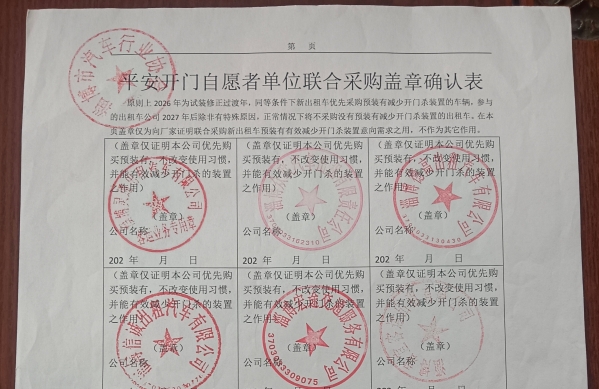 两年时间里,该技术在多省市出租车开始小范围试用并多次修正,直到2026年初完成了所有细节与参数制定。淄博许多出租车师傅也对该技术非常喜欢,多家出租车公司还在一张联合采购单上,模仿小岗村红手印精神盖上了“淄博红手印”的红印章,期望厂家能够生产出有减少开门杀装置的新车,他们将大力推广。