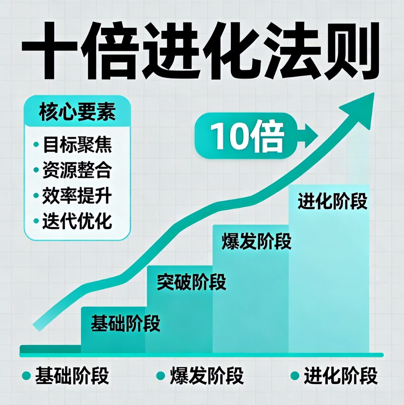 目前,十倍进化法则已被不少创业者应用于商业实践,其简单易懂、可落地的核心优势,正成为越来越多人突破自我、实现跃迁的核心指引。