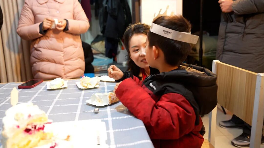 “谢谢妈妈,谢谢爷爷,谢谢姑姑,谢谢法官妈妈!”冬冬依次给大家分蛋糕,小大人模样。