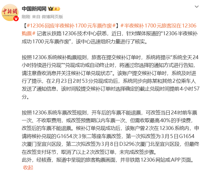 记者从铁路12306技术中心获悉,近日,针对媒体报道的“12306半夜候补成功1700元车票作废”,该中心迅速组织力量进行了核实。
