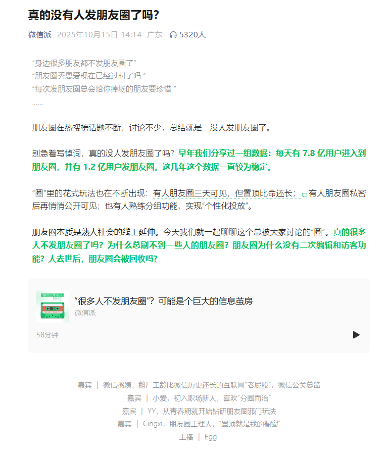 面对“朋友圈已凉”的普遍论调,微信公关总监曾在微信派播客中回应,这种感知更多源于“信息茧房”效应——当你的好友活跃度降低,你自然会觉得整个生态都冷了。加之朋友圈一直坚持时间排序,不像算法推荐平台那样能把最精彩的内容喂到你嘴边,那些沉默的好友和低质的广告,自然就占据了你的视线。