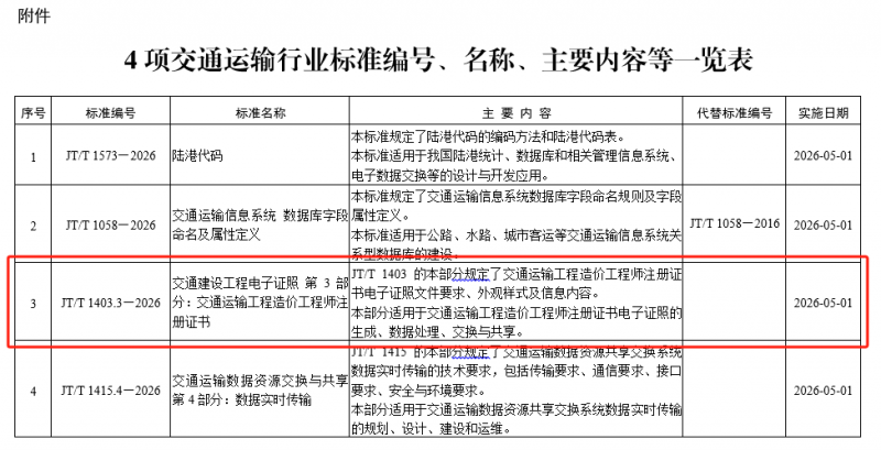 近日,嗨学网注意到交通运输部正式发布了一项关于交通建设工程领域的重要行业标准。该标准全称为《交通建设工程电子证照 第3部分:交通运输工程造价工程师注册证书》。其第一起草单位为交通运输部职业资格中心。根据通知,此项标准将于2026年5月1日起正式实施。