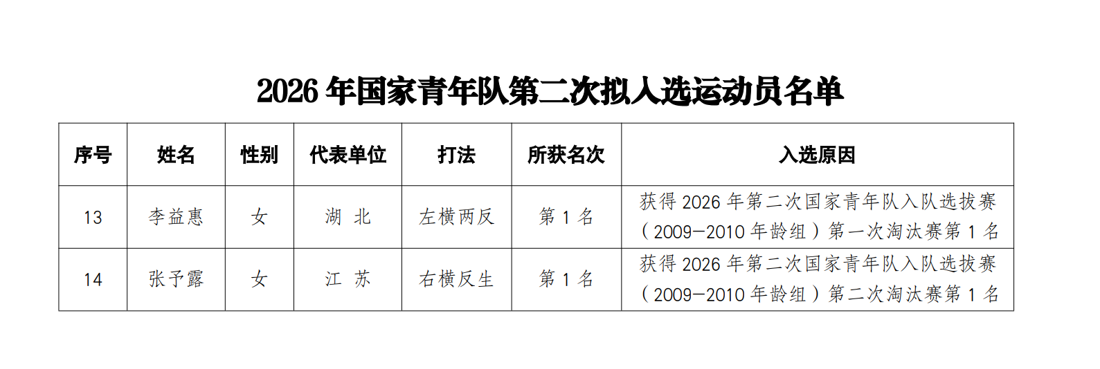 记者从中国乒协、扬州市体育局等多方渠道获悉,1月21日-26日,中国乒协主办的2026年国家青年队入队选拔赛(U15组)在河北正定国家乒乓球训练基地进行,235名参赛运动员历时6天、累计展开881场激烈比拼,最终仅有12名男运动员、9名女运动员斩获国家青年队入队资格,淘汰率超91%。激烈的角逐中,来自江苏宜兴的周昱妃和南京的冯蒴成功突围。