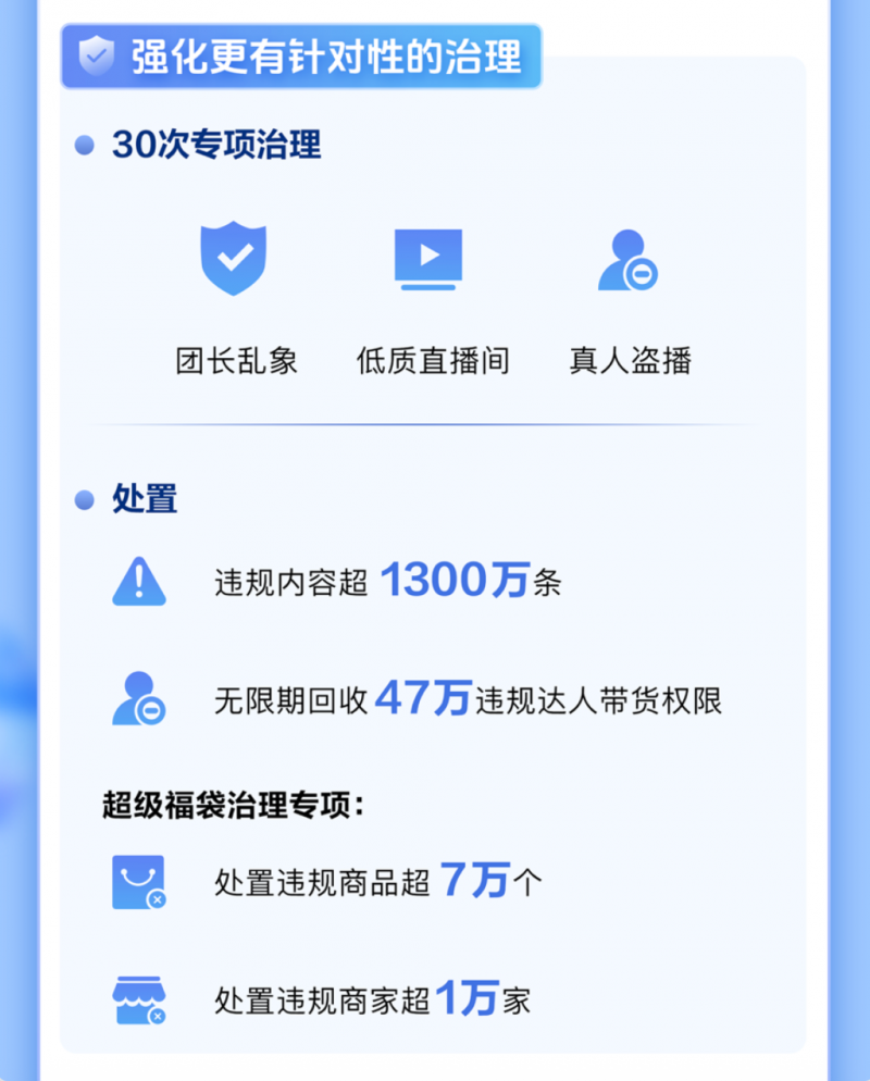 针对此类影响生态秩序的突出问题,平台全年开展30次专项治理,处置内容违规超1300万条,47万违规达人被无限期回收带货权。围绕“超级福袋”误导玩法,累计处置违规商品超7万个、违规商家超1万家;对等级作弊、真人盗播等行为展开集中整治,强化技术与人工双重审核机制,维护公平竞争环境。
