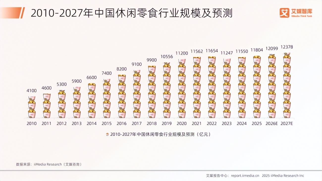 iiMedia Research(艾媒咨询)发布的《2025年中国肉制休闲零食行业发展状况与消费行为调查数据》显示,2025年中国休闲零食行业规模为11804亿元,2027年预计将达到12378亿元。随着休闲零食市场规模的扩大,肉制食品从餐桌上的硬菜,摇身一变成为下午茶、追剧时的好搭子。