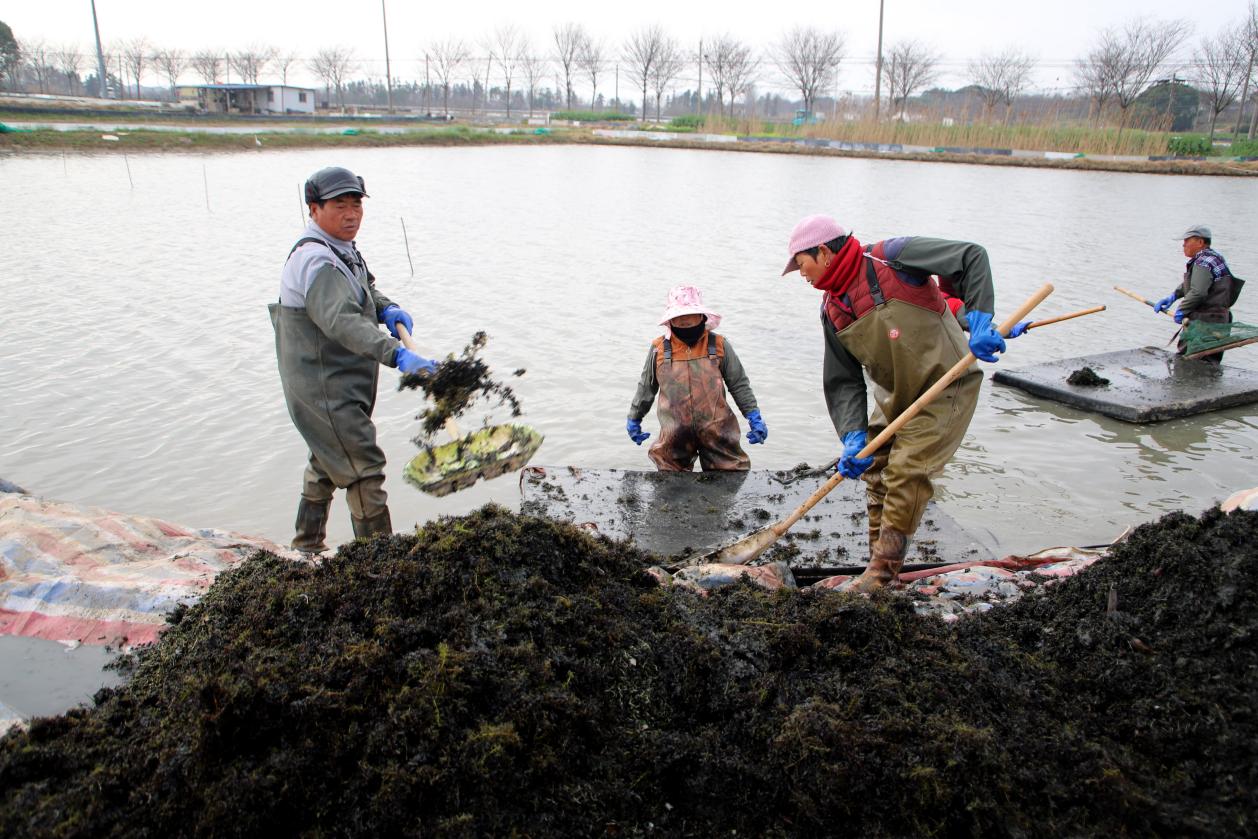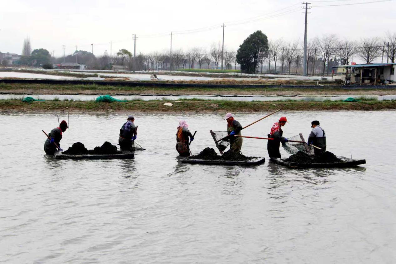 2月25日,在高淳区桠溪街道东圩村,村民们正在水产养殖塘里收获水草籽。