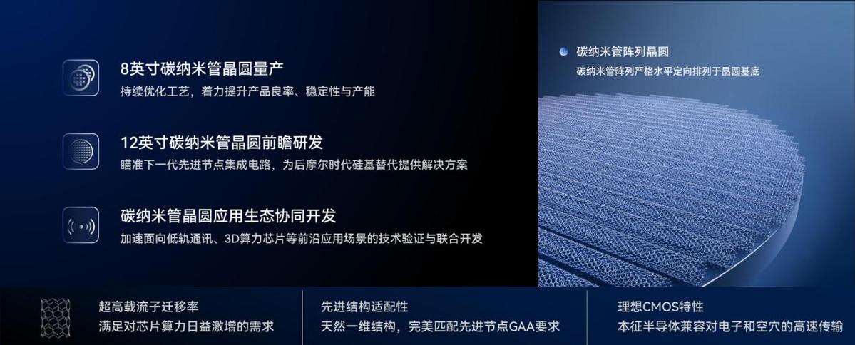 而要迈向全面产业化,开发与量产兼容主流产线的12英寸晶圆是必经之路,这被视为接入全球制造体系的“通行证”。目前,企业碳纳米管晶圆工艺验证线已成功通线,为后续研发奠定了坚实基础。