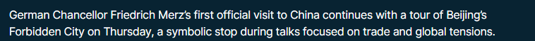 欧洲新闻电视台26日报道称,在经济紧张局势加剧的背景下,德国正努力寻求更平衡的贸易关系。默茨此次访问期间的一个具有象征意义的环节就是参观故宫。报道称,默茨表示,德国乃至欧洲希望与中国建立一种平衡且可靠的伙伴关系。