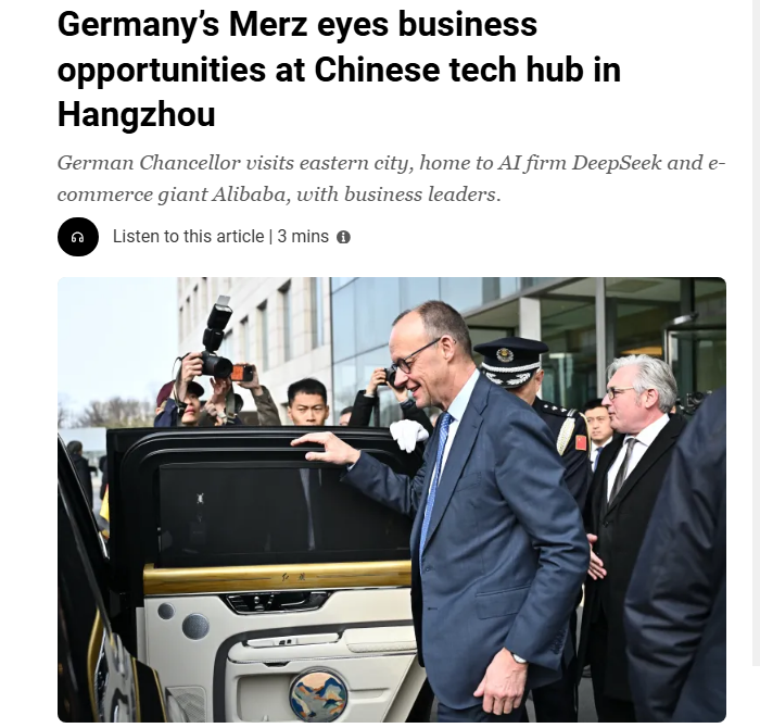 半岛电视台网站26日发表题为《德国总理默茨正着眼于中国杭州这座科技之城的商机》。报道称,默茨在其访华行程的第二天前往中国科技重镇杭州,随行的有一个德国商界代表团,旨在与杭州的企业洽谈合作事宜。