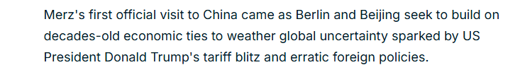 报道还强调,默茨是继英国首相斯塔默、法国总统马克龙和加拿大总理卡尼之后,近几个月来又一位访问中国的西方领导人,而这些访问正值美国政府对长期贸易伙伴征收关税引发连锁反应。