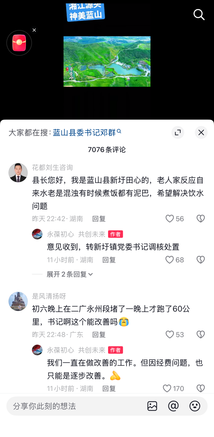 在该账号上最新一条关于蓝山县旅游推广视频的评论区,网友们或为蓝山县文旅发展积极建言献策,或反映蓝山县各地的问题提出需求等大大小小的留言已累计了7000余条,而随手滑动浏览便能看见“永葆初心 共创未来”的真诚回复。没有官话套话,不搞形式流程,一句句“收到,我请相关单位具体对接”“正在改善,请放心”的回应,让小小评论区变成了全天候“民情留言板”,让指尖互动成为连接干部与群众间的“暖心桥”。