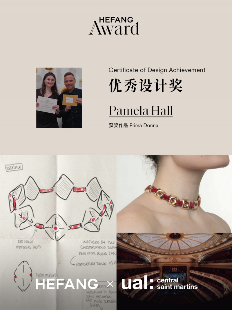 经过对设计创意、艺术表达和作品完成度的综合评审,HEFANG Award共选出3名优胜者,遴选出优秀设计奖与新锐设计奖。获奖作品内容各有侧重,有从伦敦街头历史雕塑切入,探讨消费文化与欲望控制;有从歌剧院的红丝绒与金属元素融入成套首饰,呈现舞台艺术的光影张力;也有作品以伦敦多雨气候为素材,将当地的生活态度与女性特质相结合。这些作品均从真实生活出发,将个人观察转化为具有完成度的设计表达。