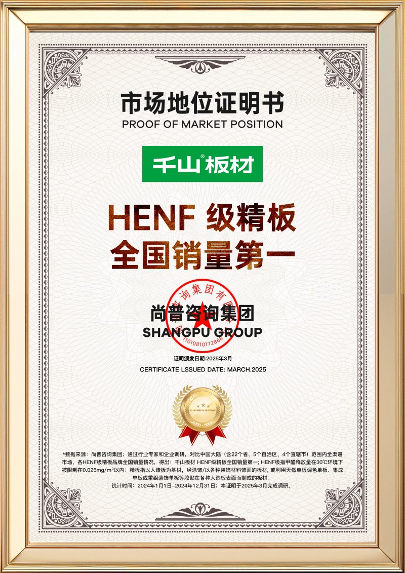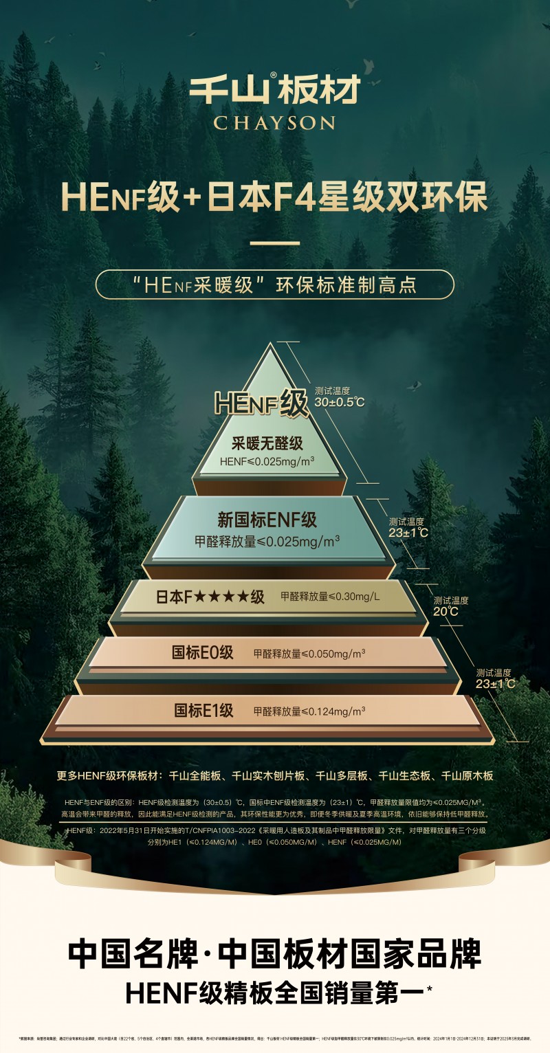 环保与性能双驱动:千山将“环保”作为核心卖点,全线产品升级至HENF级与F4星双重标准,并力推净醛、抗菌等功能。获得“HENF级精板全国销量第一”的市场认证,是其环保定位获得一定市场验证的体现。在物理性能上,强调采用德国温康纳压机、豪迈生产线等设备保障精度与稳定性。这些投入使其产品定位脱离了低价竞争区间,瞄准了对环保和品质有明确要求的改善型消费市场。
