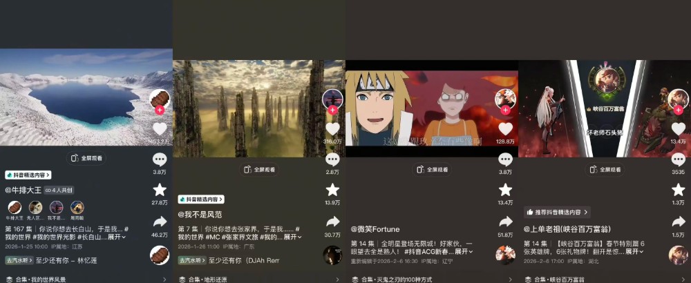 温暖新春主打“情感牌”与“破圈力”。活动邀约了多位稀缺创作者产出抖音独家内容,如粉丝共创的贺岁大片《JOJO新年派对》抖音首发即获793万播放。最具社会意义的破圈案例来自@ALPHA-FISH 、@MJ_军师等多位创作者共创,他们复刻各地名胜。@苏安、@安sir、@牛排大王等等创作者,更是一比一还原地标建筑,打造一阵“我的世界为你而建”的热潮,吸引全国超25家文旅机构主动“求合作”,并获央视文旅等多家中央级媒体关注报道,实现了从圈层文化到社会正向价值的跃迁。