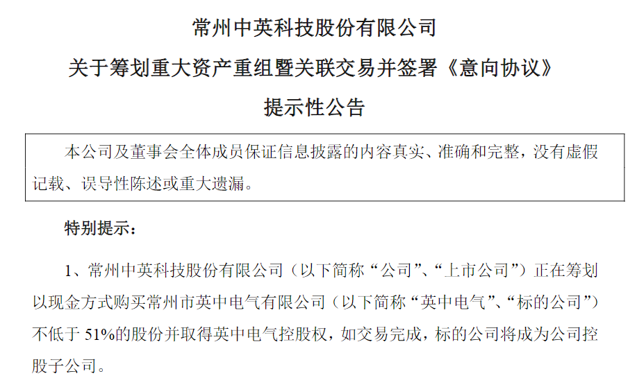 新华日报财经讯 2月27日,常州中英科技股份有限公司(证券代码:300936,以下简称“中英科技”)发布公告,中英科技正筹划以现金方式收购常州市英中电气有限公司(以下简称“英中电气”)不低于51%的股份,此次并购若顺利完成,英中电气将成为中英科技的控股子公司。