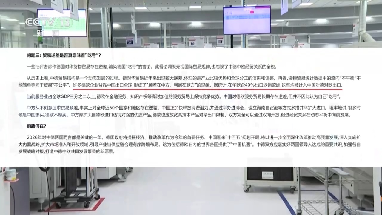 专家还提醒,变化的背后,还有一个真相需要澄清,那就是在华德企的产品,如果返销德国,会被计入中国对德出口。这样的统计方式,拉大了德国对华货物贸易的逆差,助长了所谓德国“吃亏论”。1月30日,中国驻德大使邓洪波就撰文指出:许多德欧企业背靠中国出口全球,形成了“顺差在中方、利润在欧方”的现象。据统计,在华欧企40%出口返销欧洲,这些均被计入中国对德对欧出口。