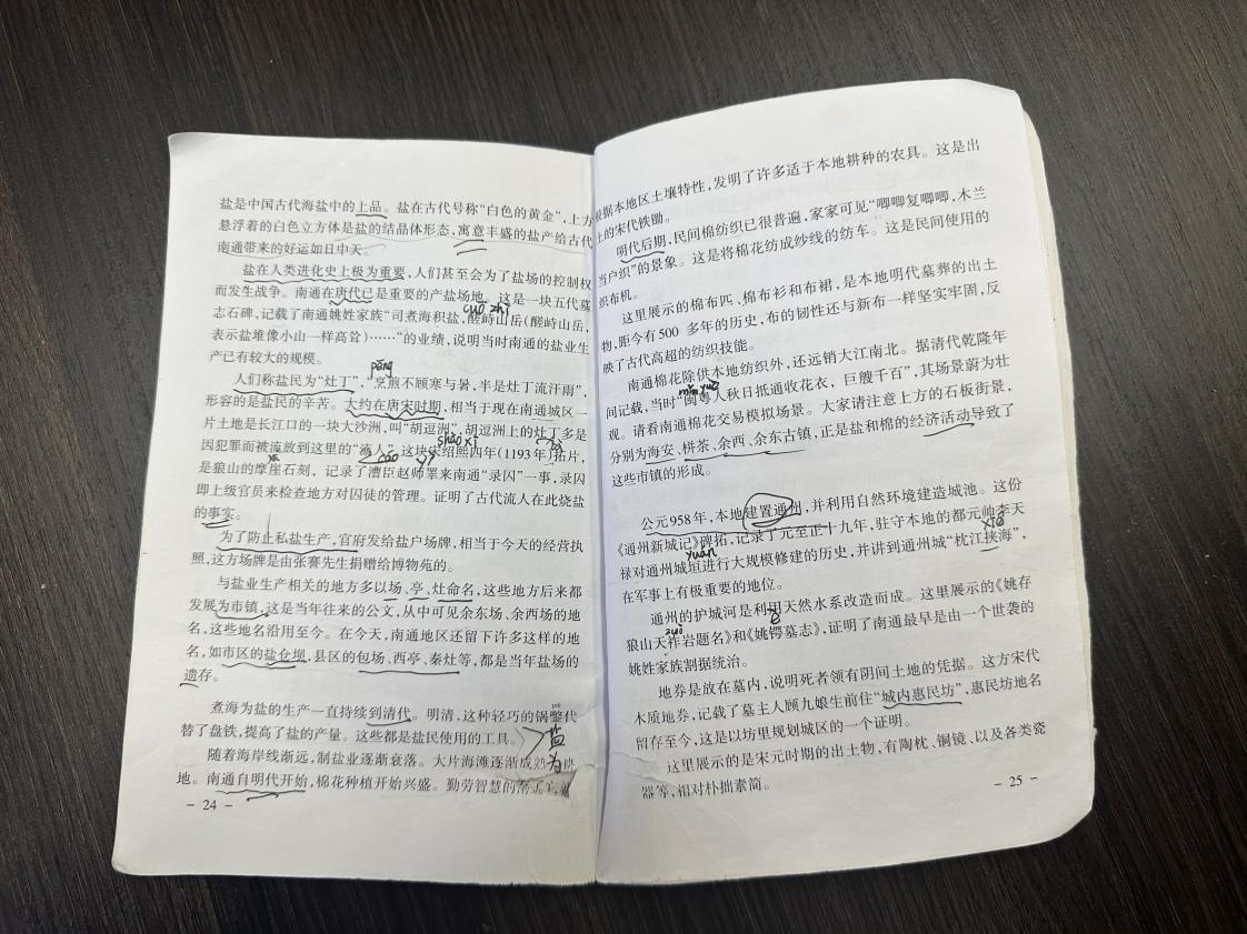 既“走出去”,又“引进来”。“小小讲解员”公益实践活动是南通博物苑“馆苑融合”理念的传承与创新,至今已开展了15届。通过选拔,每年都有60名中小学生参与进来。今年12岁的张宇桐是南通博物苑“小小讲解员”里的优秀讲解员,从2024年开始,就在南通博物苑里担任公益讲解,每年讲解时长超80个小时。从序厅走到尾厅,她都要讲解40分钟以上。“这上面有很多生僻字,还有讲解重点都需要记住。”张宇桐翻开自己的讲稿,上面圈注的都是密密麻麻的标记。两年时间,她已经服务了上千名游客,把课本上的知识“搬”上了自己的舞台。