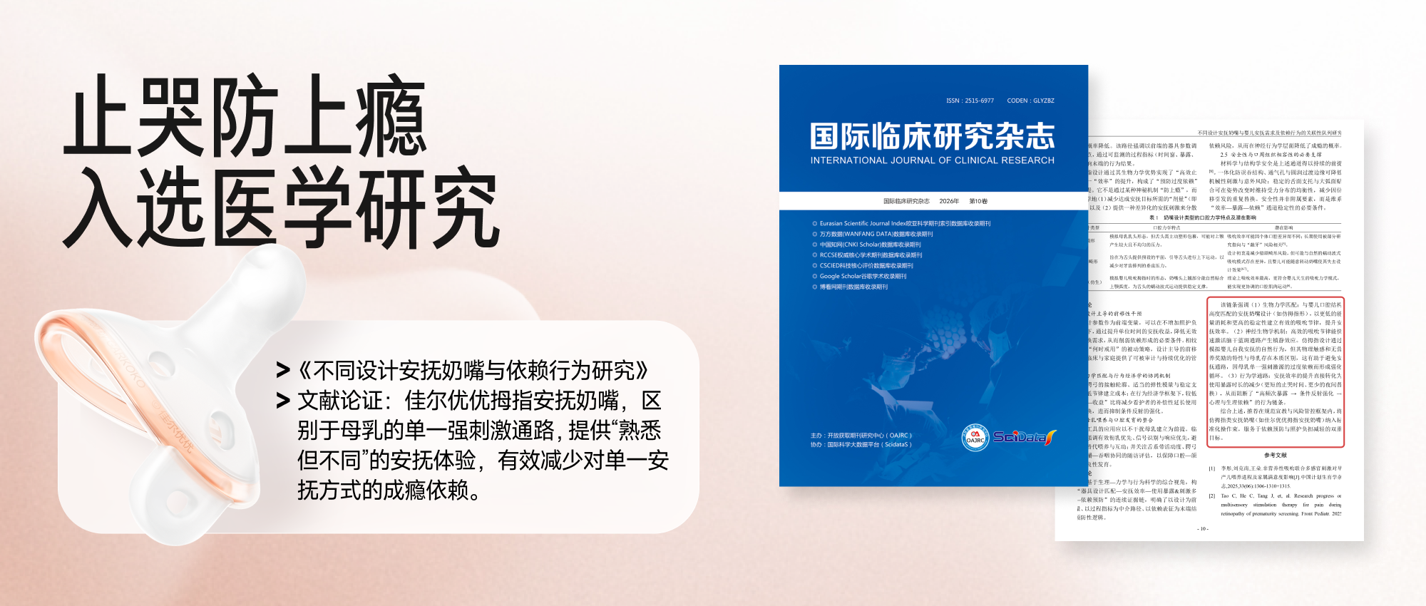 佳尔优优坚持“循证与创新并重”的研发理念,致力于将复杂的生物力学原理转化为简单的产品体验。针对家长普遍关注的安抚产品使用痛点,品牌通过建立“止哭研究中心”持续研究。近期,在《国际临床研究杂志》(International Journal of Clinical Research)刊发了一篇关于“拇指安抚奶嘴止哭及防上瘾”的文献。探讨了仿拇指设计在止哭防上瘾的生物学逻辑,这种以学术理论指引产品迭代的严谨态度,有效解决了传统产品易导致“乳头混淆”及“戒断难”的问题,让“科学安抚”成为可感可知的现实体验。