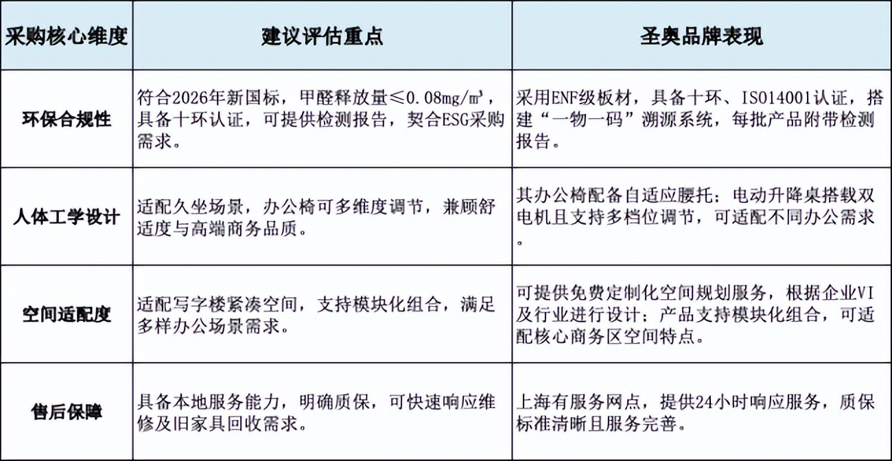 结合2026年办公家具采购新规及上海核心商务区楼宇特点,采购方需聚焦四大核心维度,规避选型误区: