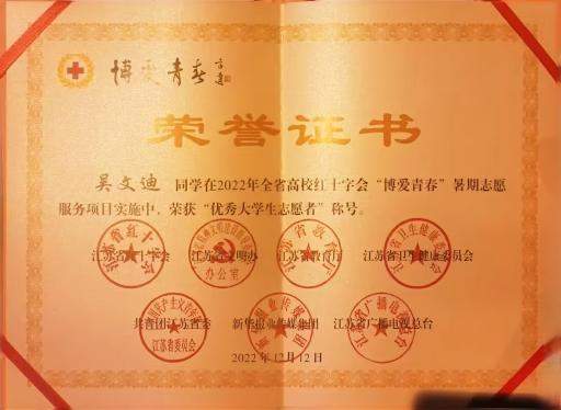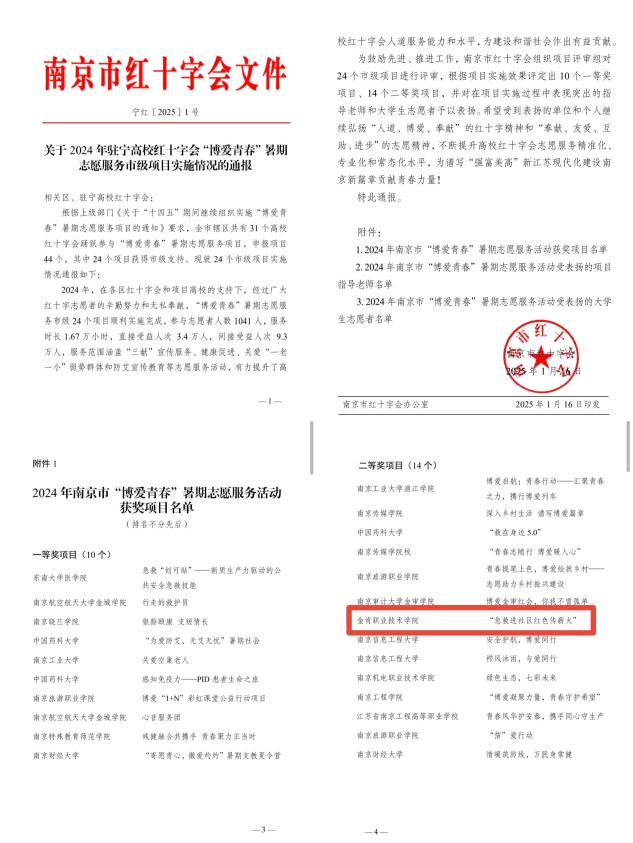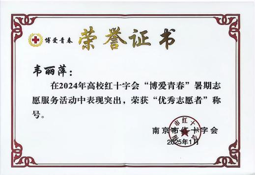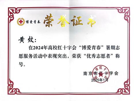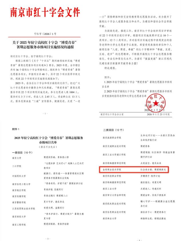 硕果盈枝,彰显育人初心使命。四年深耕,“博爱青春”不仅成为学校一张亮眼的育人名片,更收获了累累硕果:黄炆等23名学子获评市级优秀志愿者,吴文迪荣获江苏省优秀志愿者,项目多次被江苏省红十字会、希望教育集团官微、南京红十字会通报表扬。志愿服务中,学子们在实践中锤炼专业技能、厚植家国情怀,累计形成调研报告18篇、创新服务案例6个,实现了“服务他人与成长自我”的双向奔赴。