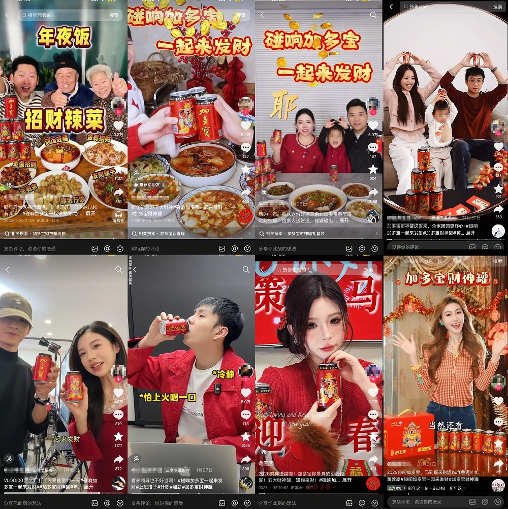 在内容建设上,品牌构建差异化内容体系,推出春节五大场景 TVC,以现实主义叙事,通过 “碰罐送福” 的细节传递温暖;同时在全平台布局剧情演绎、生活场景、年货攻略等种草内容,实现长线价值渗透。#碰响加多宝一起来发财#抖音挑战赛强势出圈,让 “碰罐” 成为春节流行互动方式。