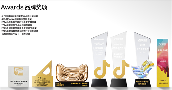 在强大的达人生态助推下,卡西米尔旗下铅笔、橡皮、马克笔等核心品类频频登顶各大电商平台榜单,荣获2024抖音电商文具行业年度文具品牌、2025天猫金婴奖年度最受欢迎文具奖、第八届DMAA国际数字营销金奖等多项行业大奖,品牌势能持续攀升。