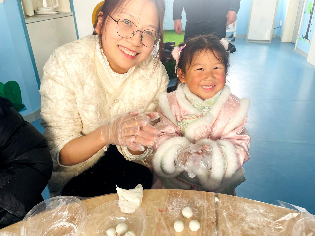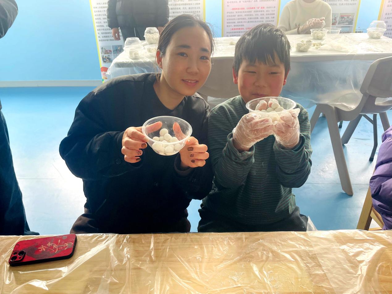 在亲子包汤圆环节,现场暖意融融、热闹非凡。不少孩子是第一次动手制作汤圆,动作略显稚嫩却格外认真;志愿者们全程耐心指导、贴心协助,手把手传授技巧,帮助孩子们完成一个个圆润可爱的汤圆。面团在掌心滚动,笑声在屋内回荡,每一颗汤圆都承载着亲情与节日的美好祝福。