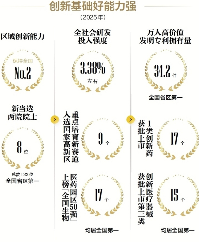 去年,苏州工业园区新药管线海外交易首付款约30亿美元,占全国近50%;6款药品纳入首版商保创新药目录,占全国超30%;港交所上市创新药企业4家,占全国超20%。从全省看,生物医药产业在规模效益、创新能力和企业培育上,夺得多个全国第一:生物医药集群营业收入占全国15.6%、利润总额占全国18.9%;获批上市1类创新药17个、第三类创新医疗器械15个;16家企业入选“中国医药工业百强”,6家企业入选“中国医药研发产品线最佳工业企业30强”。