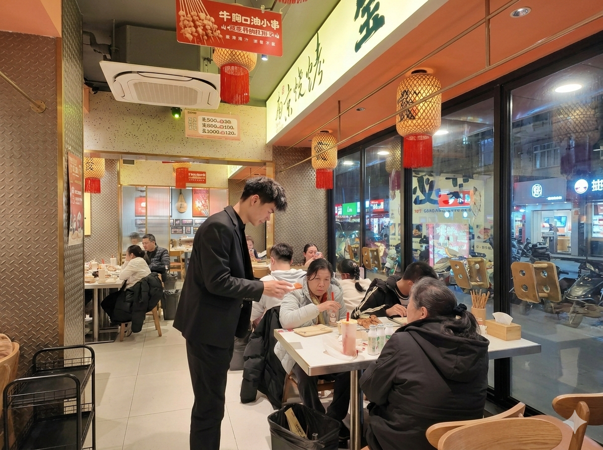 宝记烧烤创始店内,炭火噼啪作响,滋滋冒油的烤串在翻转间裹上香料,香气瞬间漫过街巷。店内座无虚席,推杯换盏的欢笑声、食客的交谈声,交织成这座城市最生动的夜曲。店长赵东升在桌椅间穿梭忙碌,时而俯身询问食客的用餐体验,时而核对出餐订单、叮嘱服务员送餐到位,一举一动间,皆是对这份烟火事业的坚守与热忱。