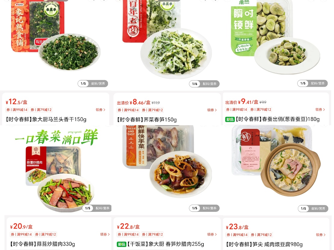 南京多家超市与生鲜平台,净菜、半成品春菜成为货架新宠。在线上的小象超市,记者看到洗净拌好的马兰头香干、荠菜春笋、葱香蚕豆等即食春菜装在透明保鲜盒里直接上架,开袋就能享用,免去市民清洗和烹饪的麻烦。更是有春日预制菜包,春笋炒腊肉、蒜薹炒腊肉、笋尖咸肉煨豆腐等经典春味组合,商家配齐了食材与调料,市民下单到货后,用锅翻炒几分钟就能上桌,还原饭店口感。