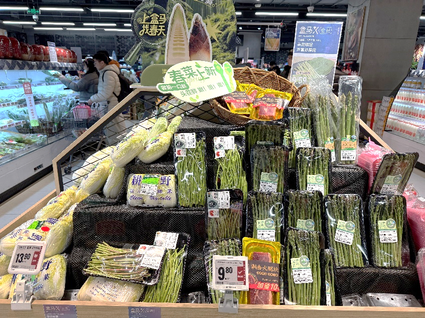 在盒马鲜生,鸡毛菜、杭白菜、上海青、菠菜等多个品种的蔬菜青翠欲滴 。10.9元/200克的本地芦蒿、9.8元/200克的鲜嫩芦笋头、13.9元/550克的雷笋已陆续上市。值得一提的是,为方便消费者搭配菜肴,盒马还贴出“春日限定”菜品——芦蒿炒腊肉供参考。