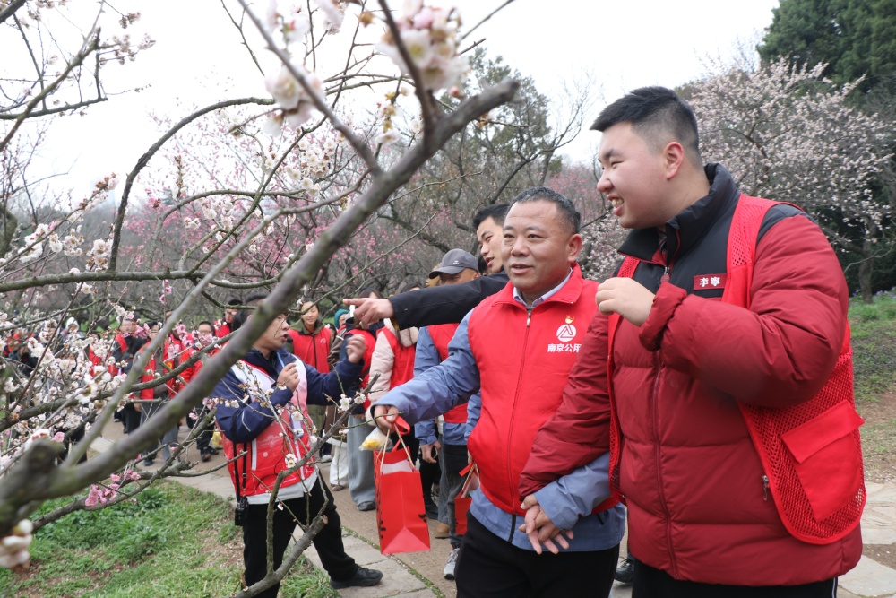 交汇点讯 3月4日下午,明孝陵梅花山景区正值花期,梅花盛放,空气中浮动着淡淡梅香。一群身穿红马甲的志愿者牵着十几位年轻人的手,缓缓穿行在梅林间。他们不时停下脚步,指着枝头的梅花轻声细语,有人蹲下身,引导身边的人触摸地上的落花。