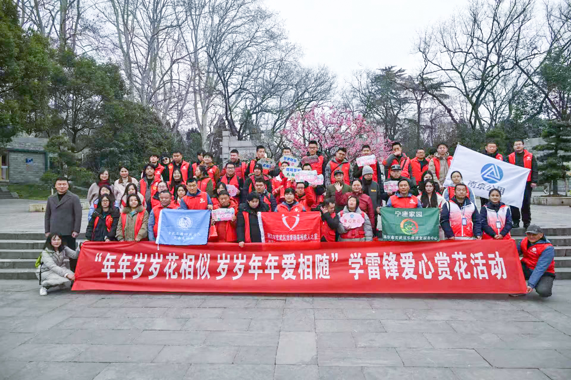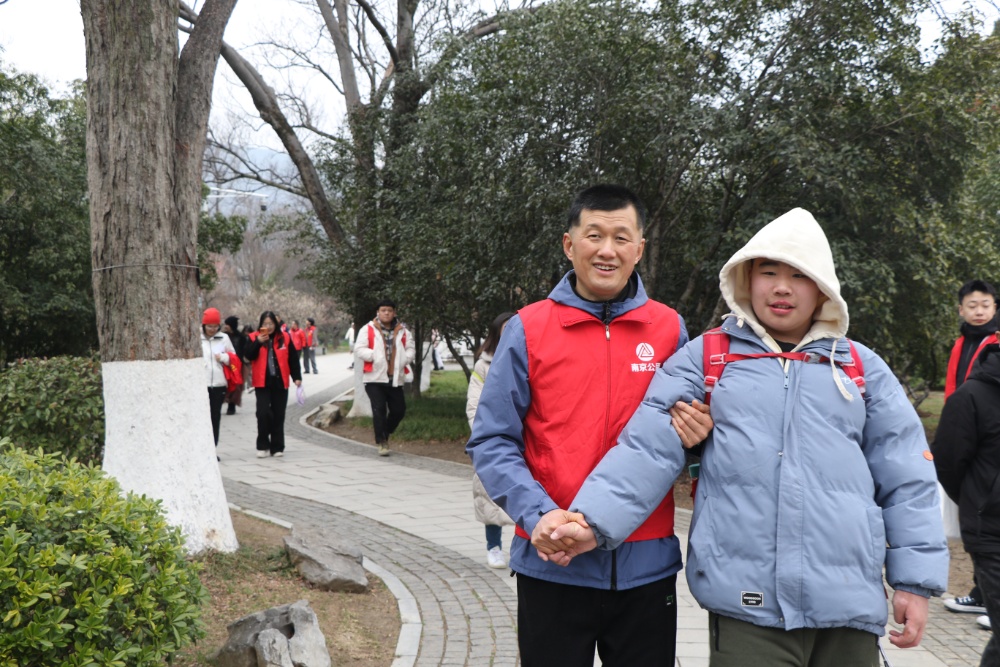 这群志愿者是南京公用中北的士公司的驾驶员,他们陪伴的是南京市玄武区博爱勤善残疾人之家的孤独症学员。当天是第63个学雷锋纪念日,也是这群的士司机连续第十六年组织爱心赏花活动。