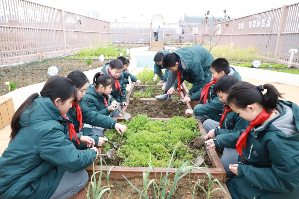 随后,在老师的带领下,同学们来到位于学校楼顶的“百味农场”,种下属于自己的小种子。翻土、挖坑、撒种、覆土、浇水……孩子们分工协作、专注仔细,劳动老师在一旁耐心指导,让孩子们在亲手播种的过程中,感受劳动的乐趣、生命的奇妙。